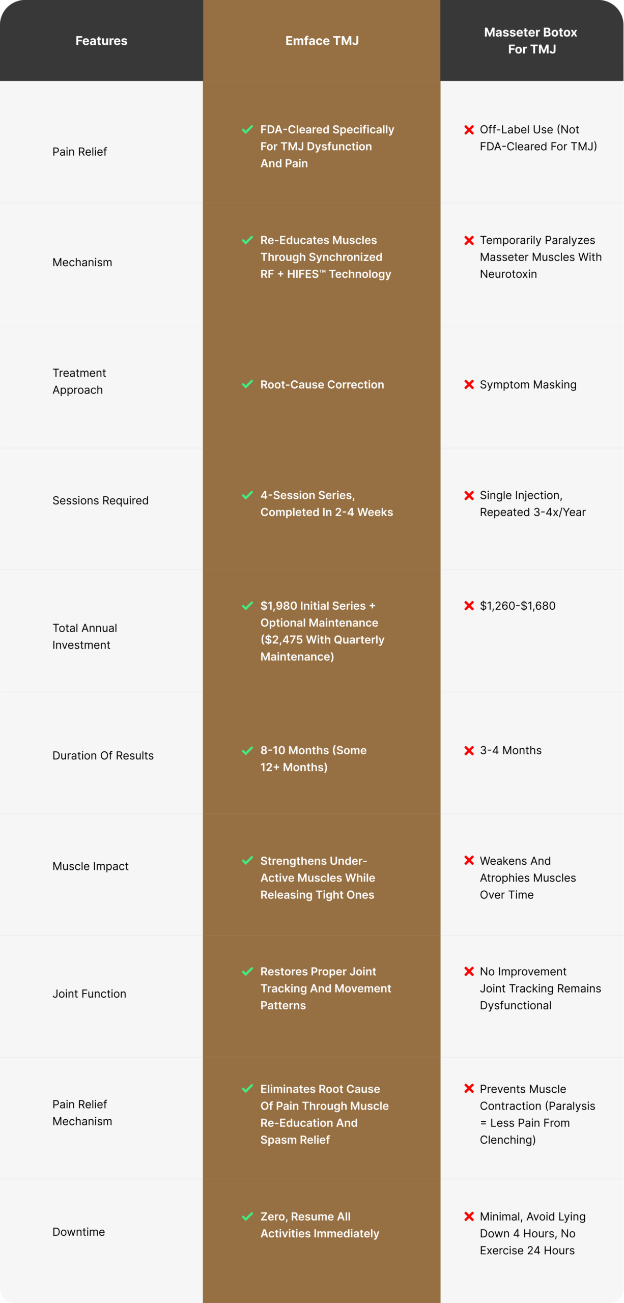 Rather than preventing pain through paralysis, Emface eliminates the dysfunctional muscle patterns and spasms causing pain. The difference? Lasting relief even after treatment ends.