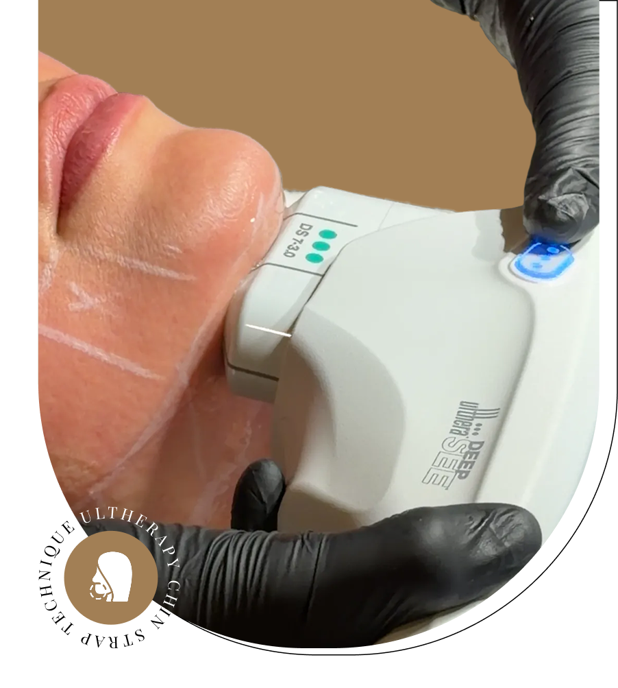 The Chin Strap Technique uses micro-focused ultrasound to create precise thermal coagulation points deep in the SMAS layer.